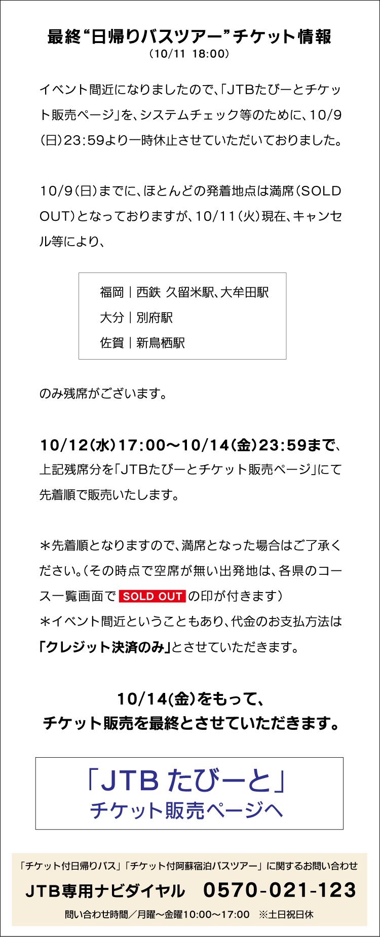 - 入金確認後、JTBから入場券、バス乗車券等を含む書類一式をご郵送いたします。当日10月22日(土)その書類を、必ずご持参ください。